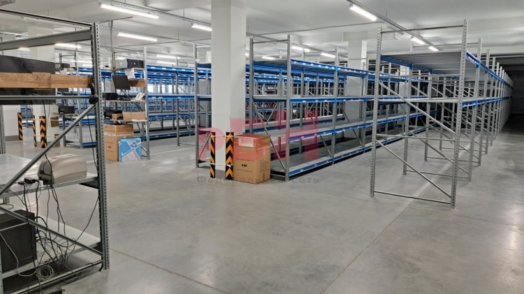 Внутри помещений уже реализована профессиональная многоуровневая система хранения. Установлены грузовые стеллажи, полочные системы, организованы зоны паллетного хранения, участки отбора и маркировки товаров. На каждом этаже предусмотрены административные комнаты, инвентаризационные помещения и санитарные узлы — сотрудникам не придется спускаться на первый этаж для решения бытовых вопросов.